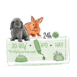 Ein junges Kaninchen benötigt ca. 45 bis 60 Gramm Futter pro Kilogramm Körpergewicht pro Tag, je nach Lebensphase und Gesundheitszustand. Achten Sie darauf, dass die Tiere alle Zutaten fressen. Sorgen Sie immer für unbegrenzten Zugang zu Heu und frischem Wasser. An einem kühlen und dunklen Ort aufbewahren.